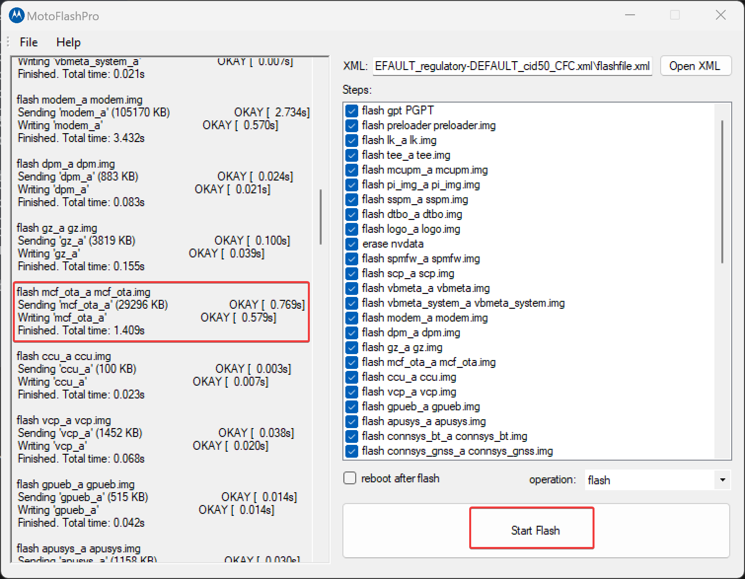 Start flashи ожидаем окончания прошивки. Во время этого процесса не трогаем ни ПК, ни смартфон. Также можно дополнительно проследить за полемmcf_ota, на предмет ошибки, их быть не должно, иначе обновления системы работать не будут.