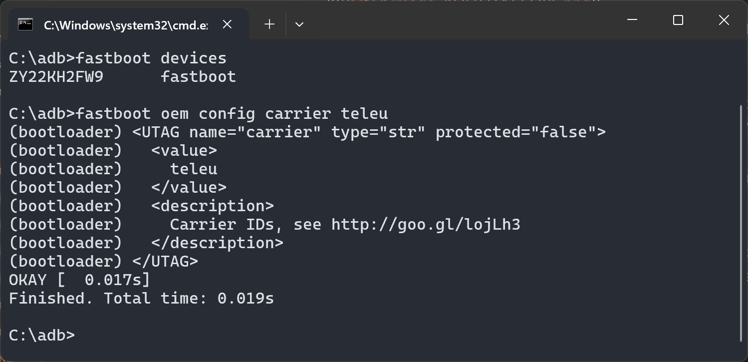 fastboot oem config carrier teleuилиfastboot oem config carrier retgb. В случае использования других прошивок: RETAPAC -fastboot oem config carrier retapac, RETCN -fastboot oem config carrier retcn.