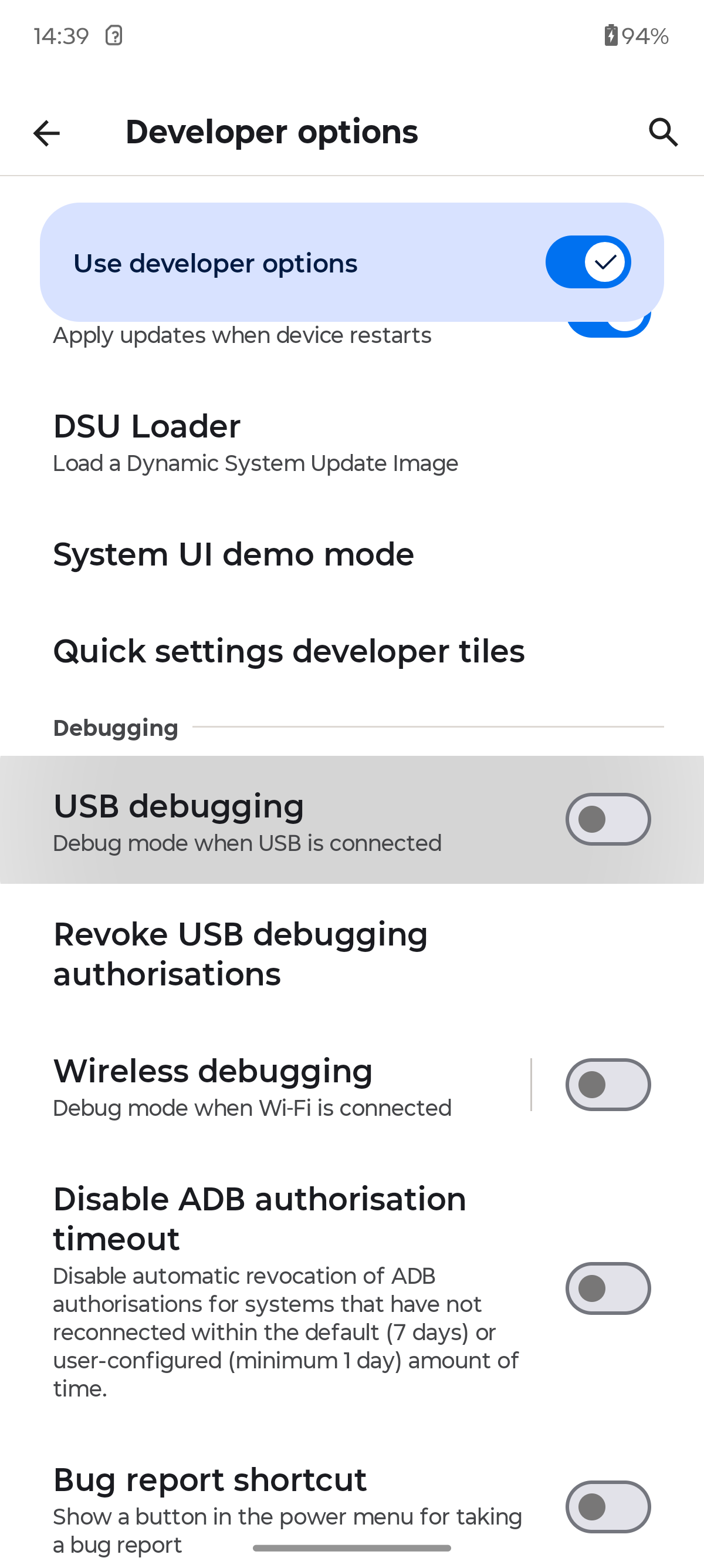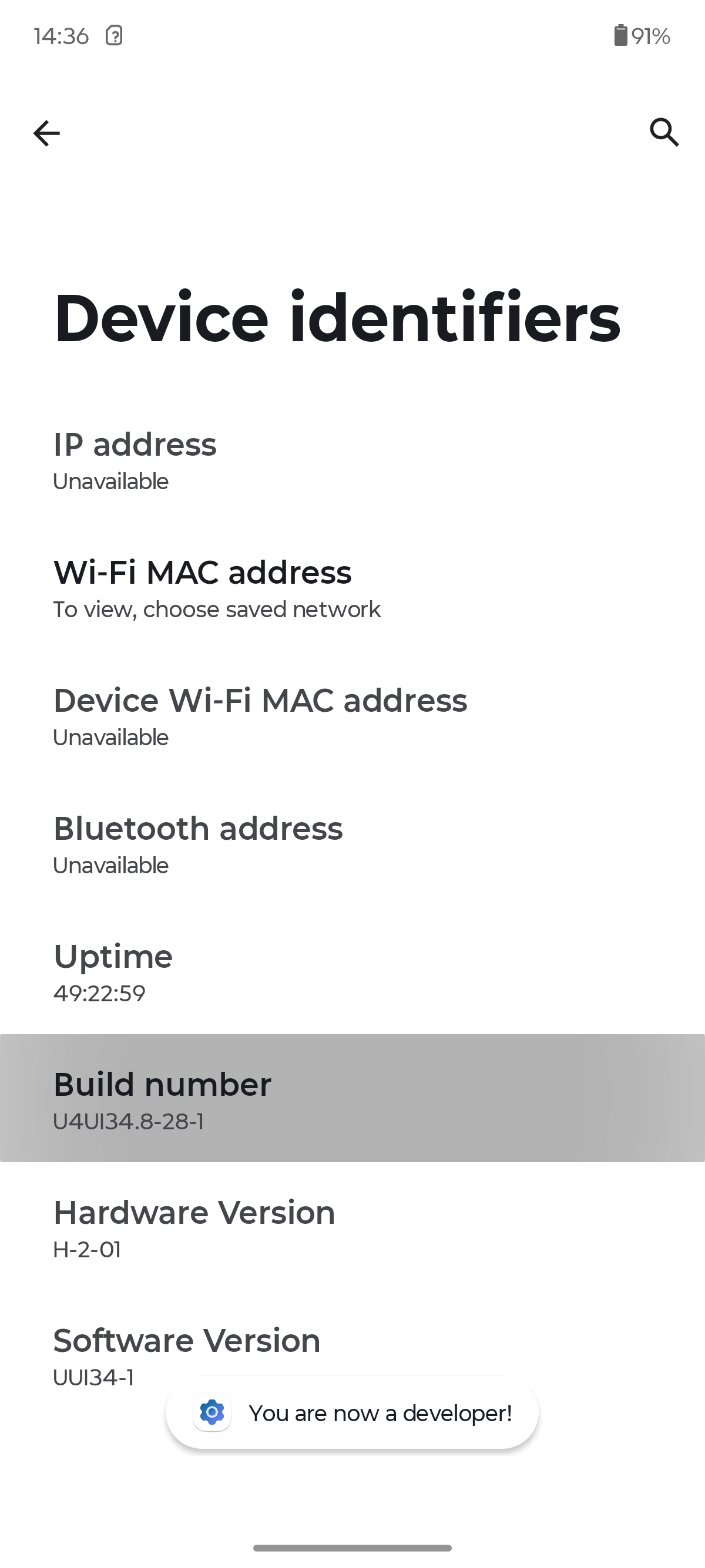 - На телефоне необходимо активировать “Режим разработчика”, для чего переходим в Settings → About phone → Device identifiers и нажимаем 7 раз на поле Build number.